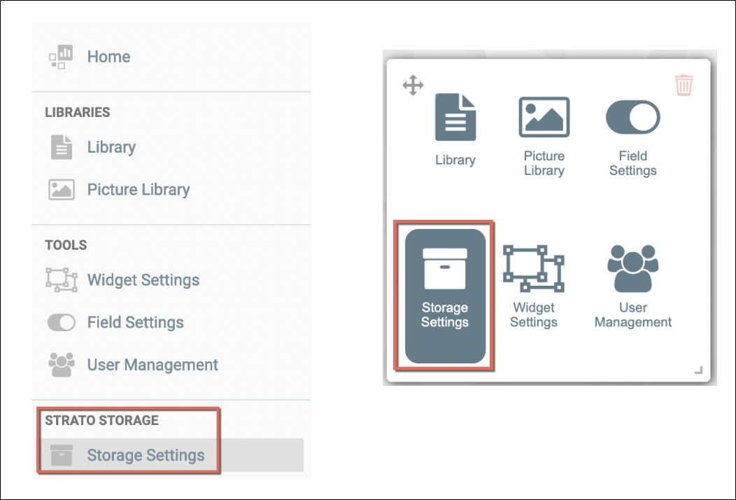 To access the File Management module, access the Storage Settings either from the left menu panel or from the tools widget from the main screen/dashboard of Strato, as shown in the screen below. Then click on the File Management menu. (Access here will depend on the organization's File Management users' authorization settings.)