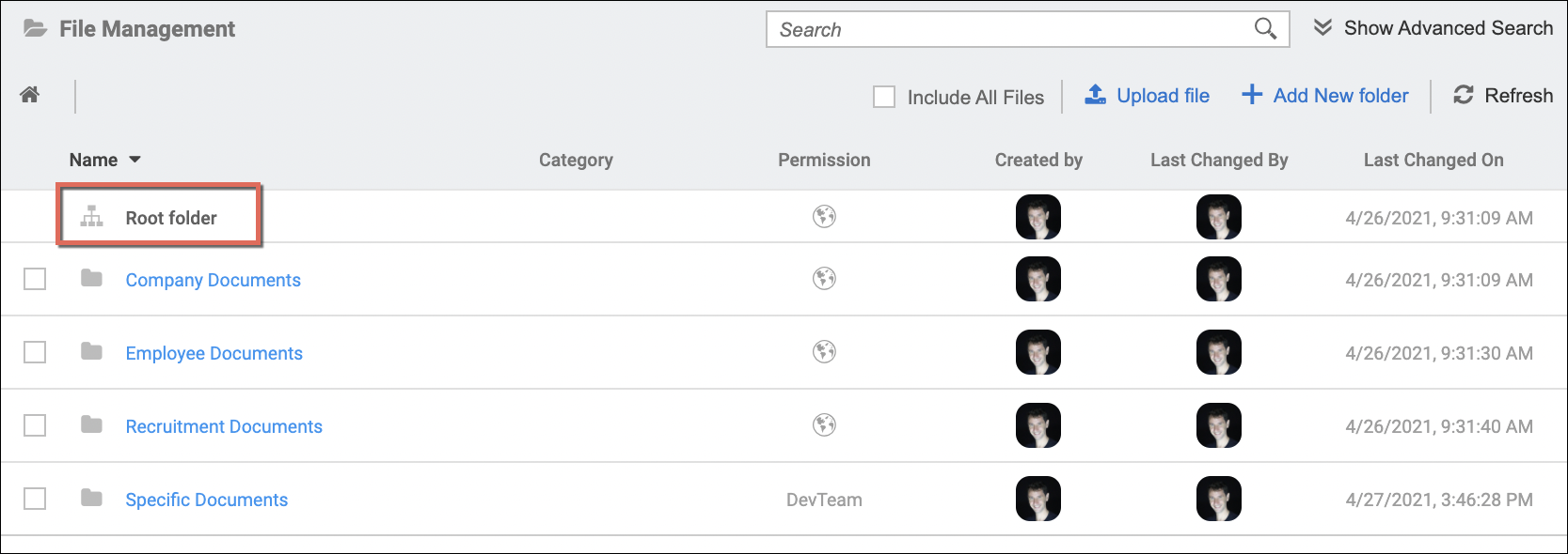 Accessing the File Management first loads the Root Folder (as highlighted in the screen above) with the other subfolders and files that you have access to - given the proper admin authorization.