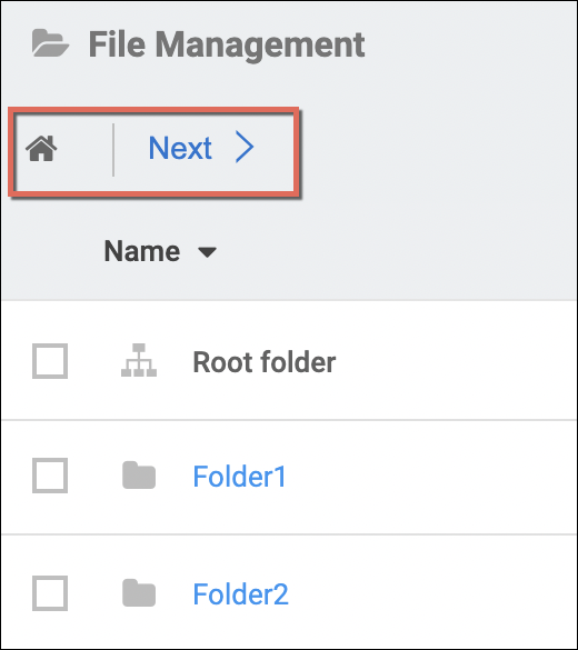 If there are many items in the File Management, there will be multiple pages on the screen. Simply click on Next or Previous to navigate through the pages. Clicking on the Home (icon) or Root folder leads back to the main screen/folder.
