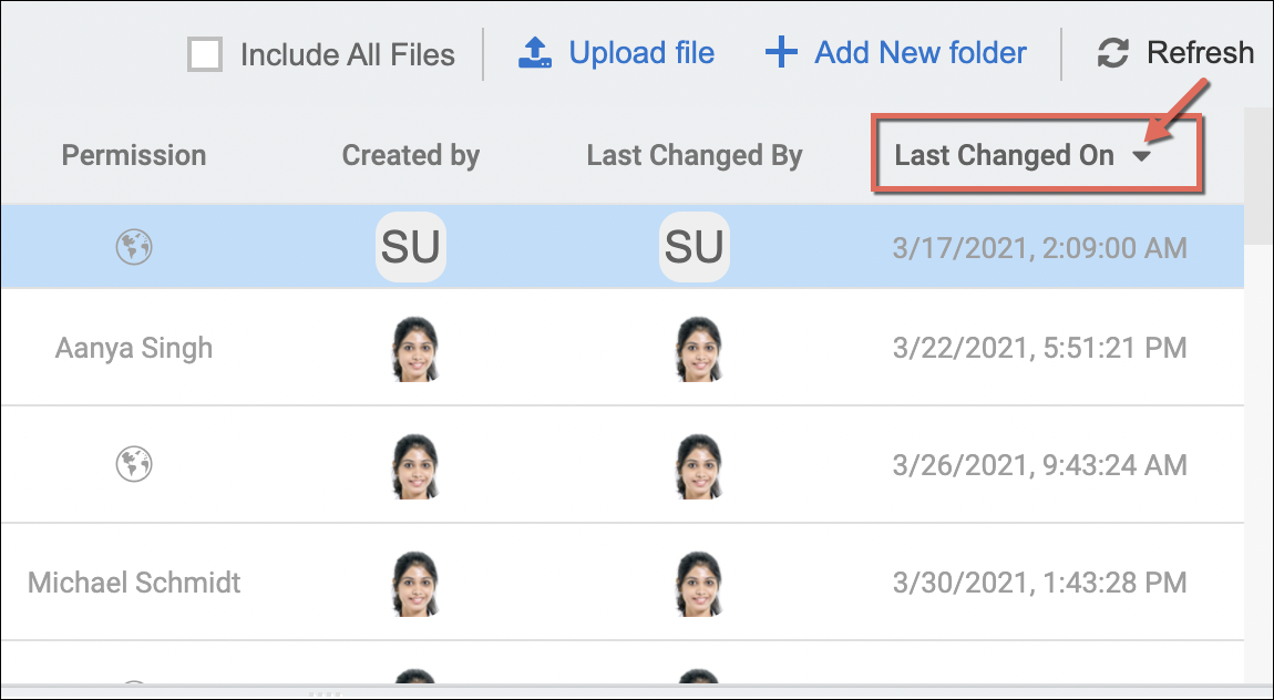 You can also sort and view the list of folders and files by Name, Permission, Created by, Last Changed by, and Last Change On in an ascending or descending order. This is done by clicking the Up/Down arrow next to the column name as shown in the sample screen below.
