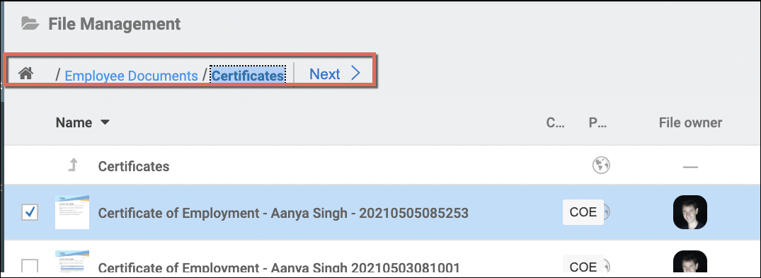 For navigating folders, clicking on a folder will traverse that folder and show the subfolders, files, and documents under it. Also, the breadcrumbs at the top would update to show where you are on the folder hierarchy. Clicking on any folder from the breadcrumbs will direct you back to that selected folder.