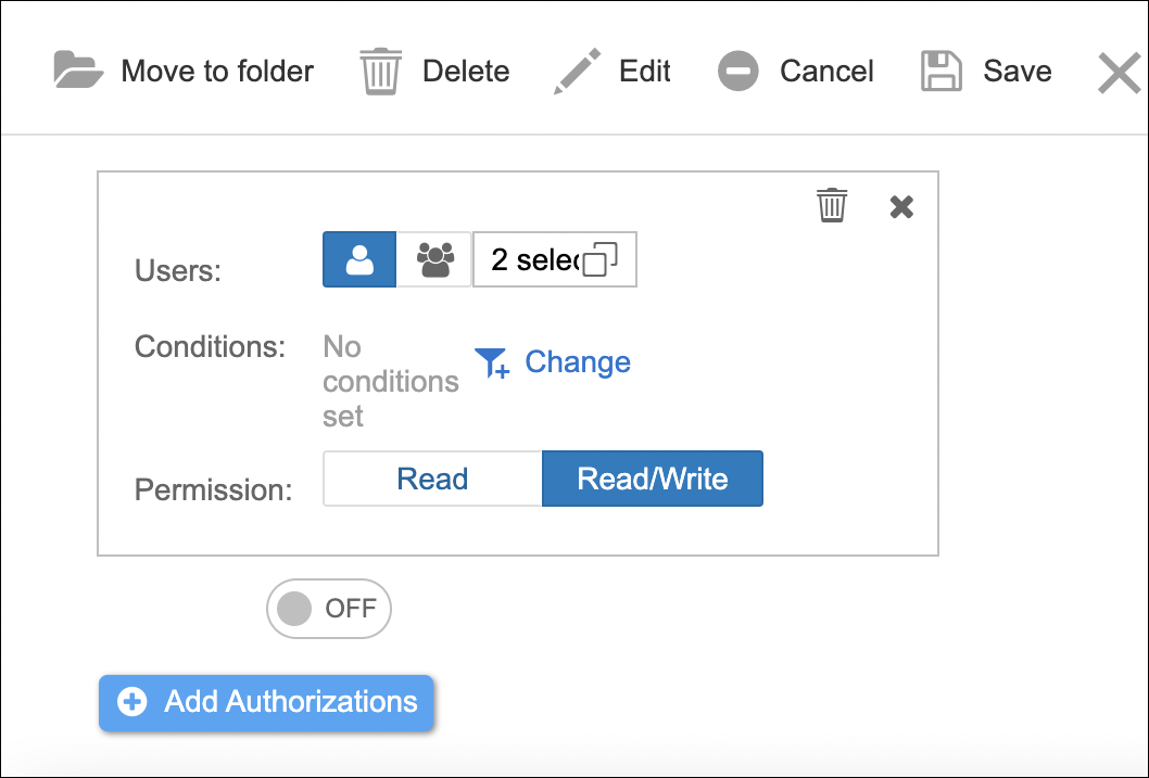 For both folders and files, if there are no specific user or user group authorizations set, this means that the folder/file is accessible internally by users who have access to the Root Folder or to any folder location where the folder or file is added.
