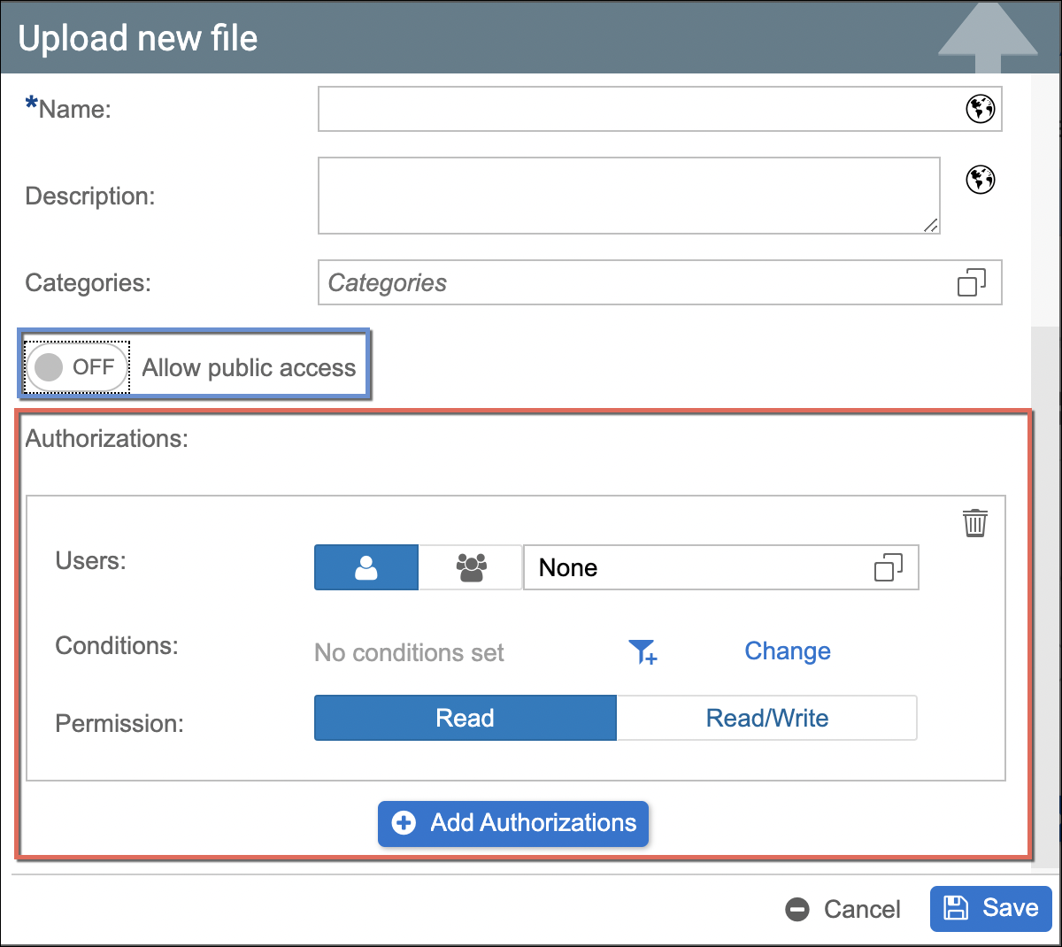 For Files, setting authorizations/permissions can be done when the Allow public access is toggled off. Otherwise, this will not enable the authorization settings as the file is being allowed to be accessed externally/publicly.