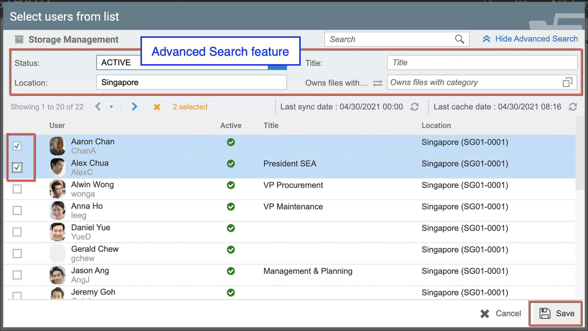 You can set authorization either for a specific user(s) or group(s) of users. When setting folder/file authorization for specific users only, clicking the selection icon will prompt the Select Users from List window. You can use the Advanced Search function to find specific users. For example, selecting users based on a particular region/country, or users who own certain files based on categories.
