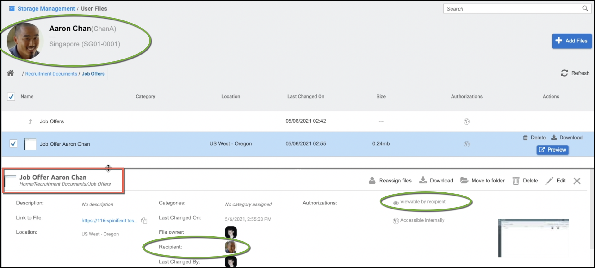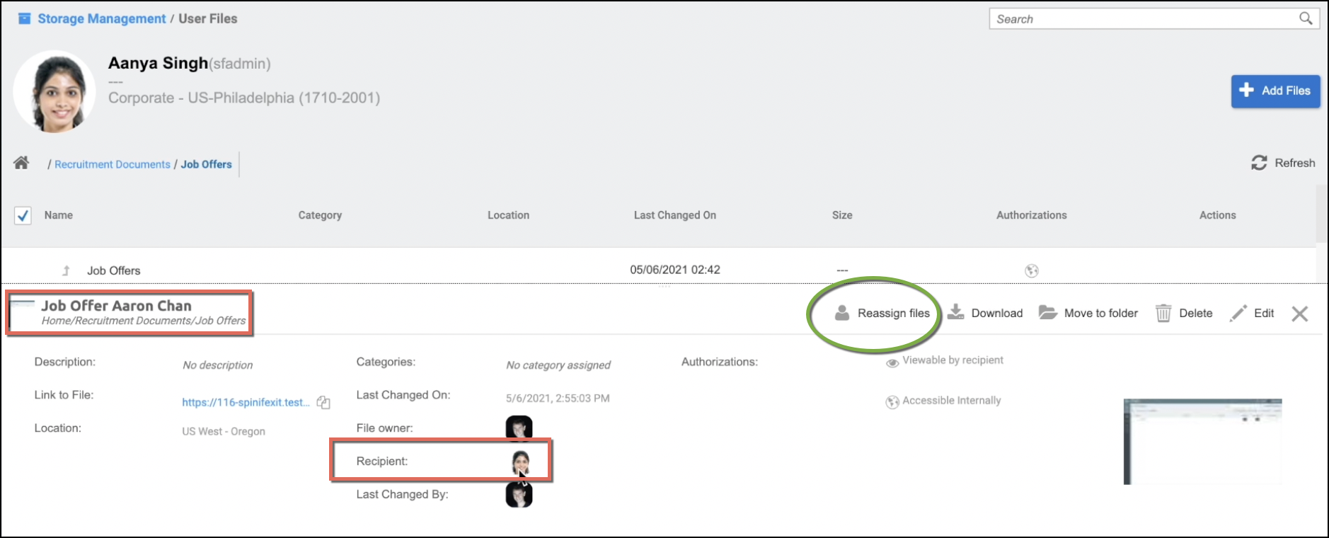 In this sample scenario, let’s say this employee is Aaron Chan and the recruiter is Aanya Singh. In the screen below, the Job Offer for Aaron Chan is saved in the recruiter’s (Aanya Singh's) Job Offers folder. The recruiter can re-assign this document to the employee, Aaron Chan, just by clicking the Reassign Files option from the file's View Panel.