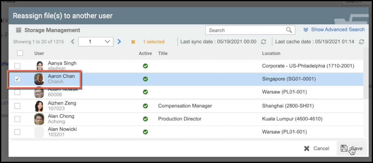 Just select the new recipient of the document from the selection screen, as shown in the screen below. In this example, the new recipient of the file is Aaron Chan.