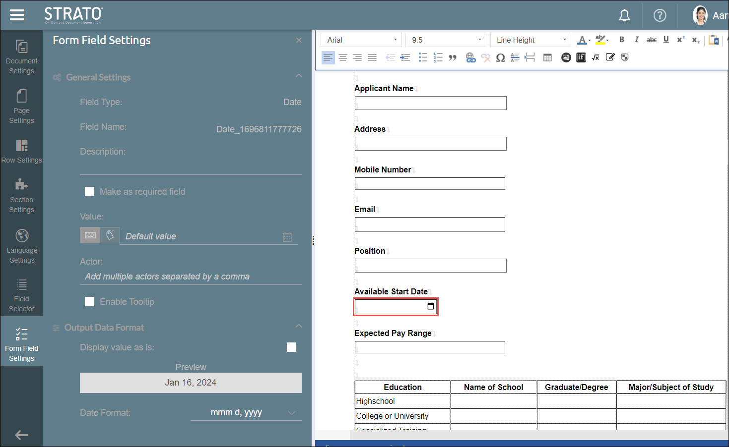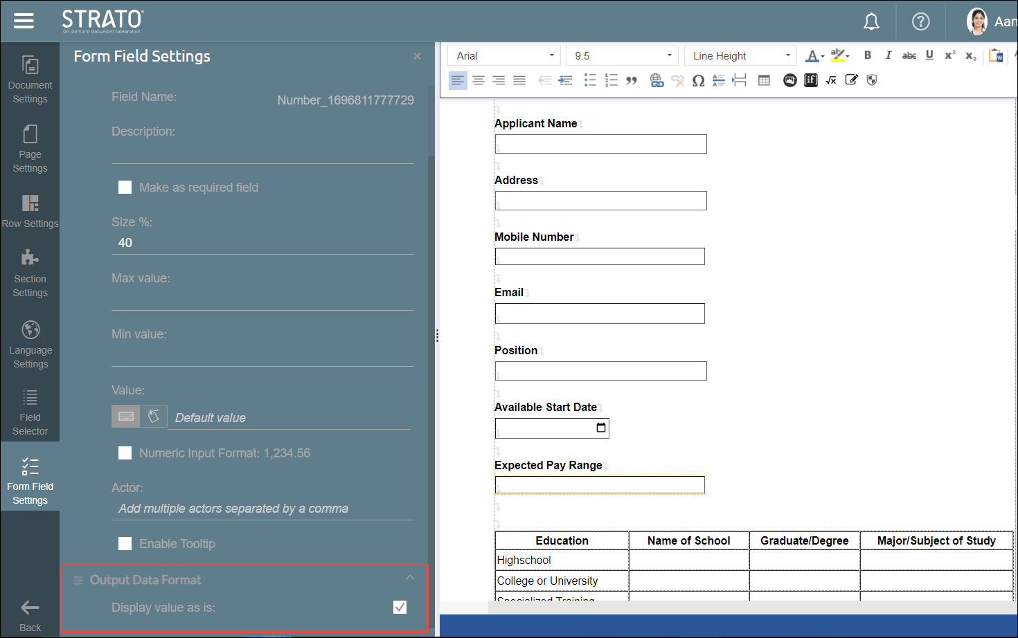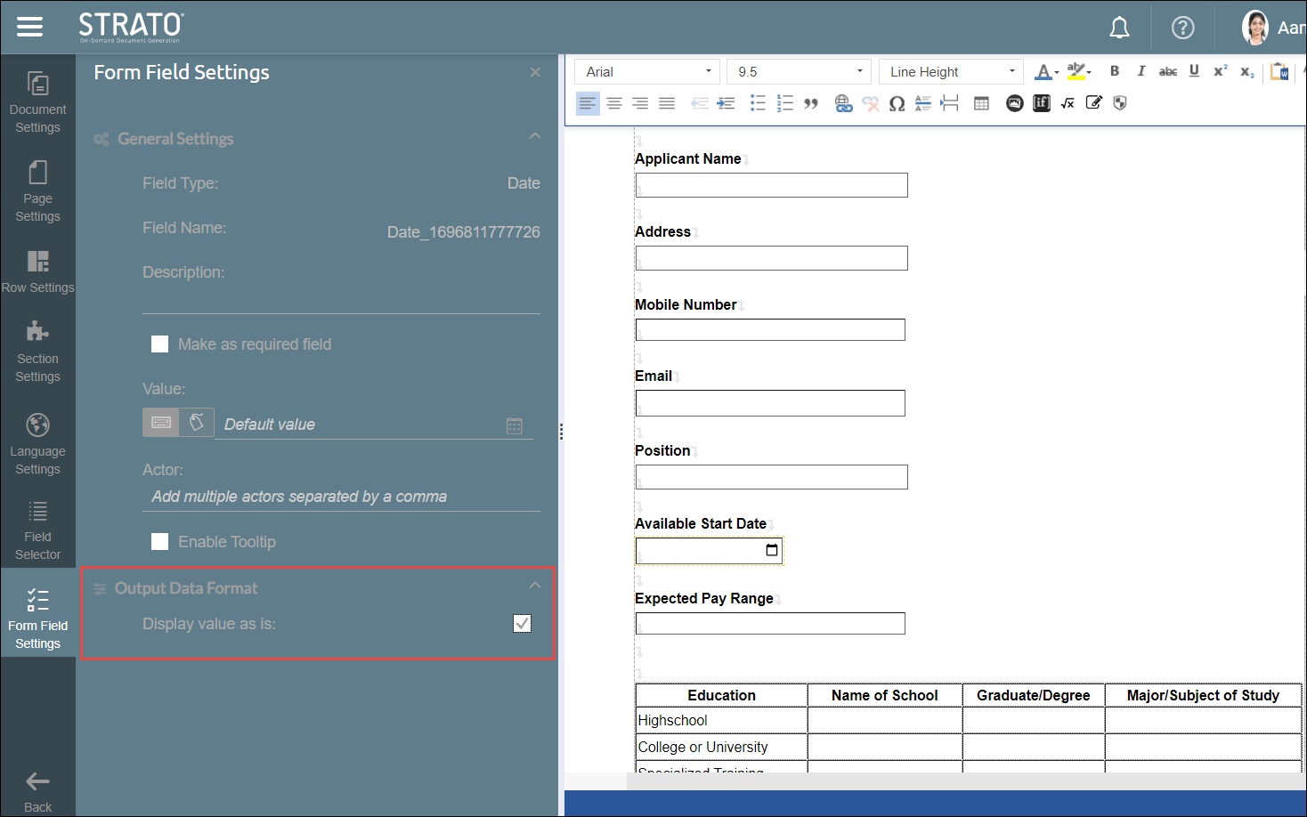 In Strato Forms, particularly in Numeric and Date form fields, administrators can customize the default output data format using the Strato Admin tool, reflecting the organization’s preferences. Additionally, administrators have the option to customize the output data format from the Strato Form editor through the Form Field Settings. The output data format applies to the form once attached to an email, previewed, or downloaded as a PDF.