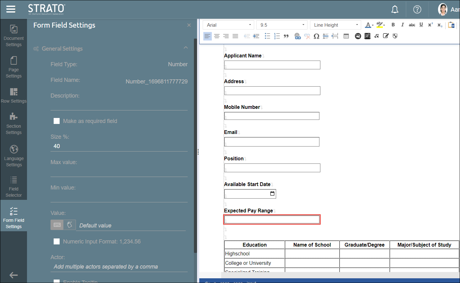 - In the Strato Form template, insert a Numeric and/or Date form field or select an existing one.