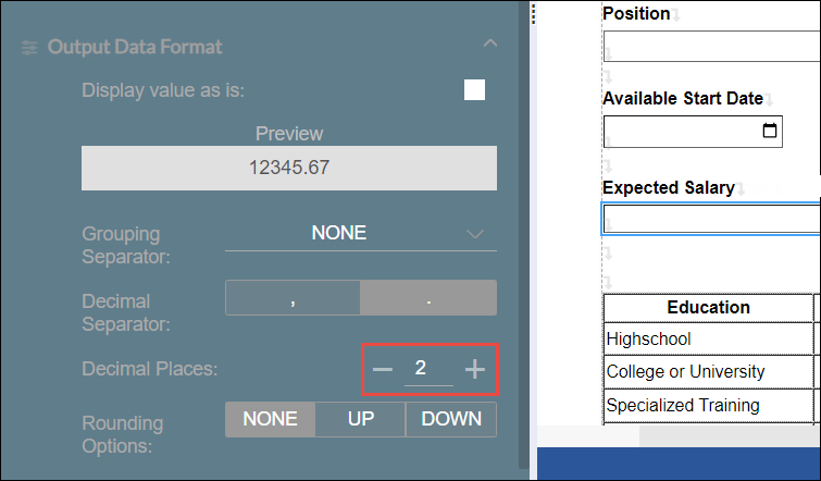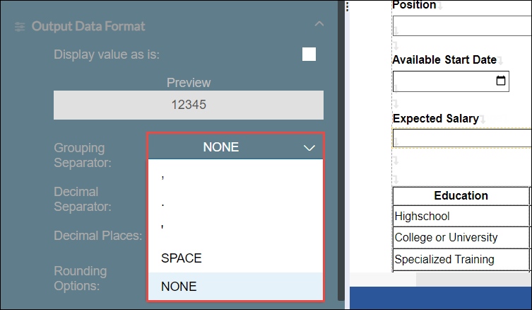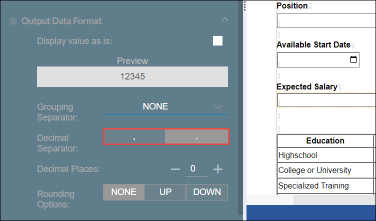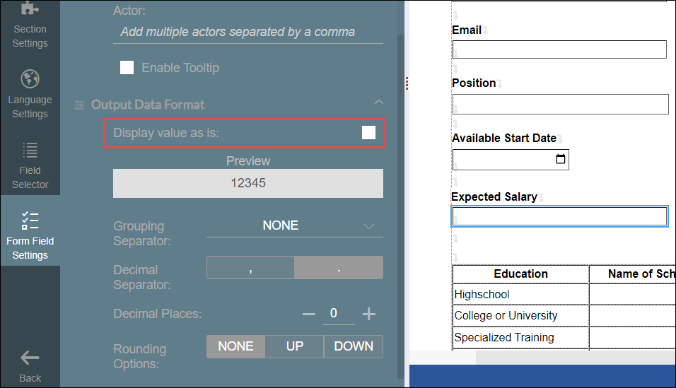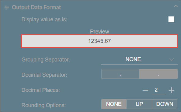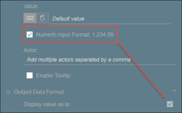 - For Numeric form field values, if 'Numeric Input Format: 1,234.56' and 'Display value as is' from Form Field Settings are both enabled, the output format will be based on how the actor entered the value: 12345.67. If both are disabled, the format configuration from 'Output Data Format' will be followed: 12’345.