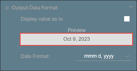 - For the Date form field, if 'Display value as is' is enabled, the output format will be based on the default date format from the admin tool: MMM D, YYYY ; Otherwise, it will follow the formatting in 'Output Data Format' in the form template editor: YYYY-MM-DD.