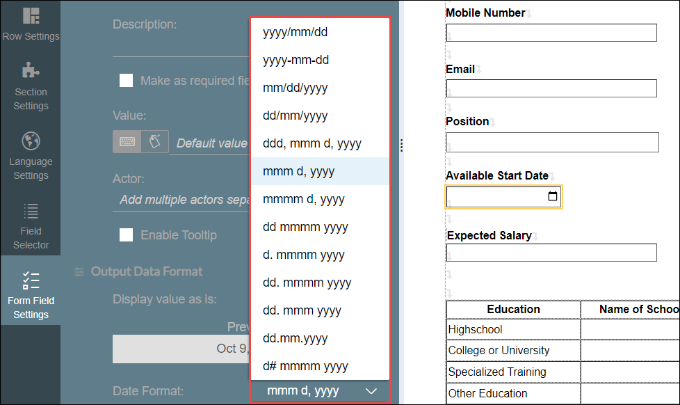 - For the Date Form Field, select the desired Date Format from the available options in the dropdown list.