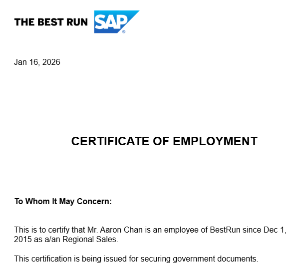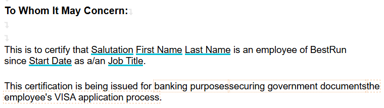 For example, a Certificate of Employment may have Template Parameters for handling reasons why an employee is requesting a copy of their Certificate of Employment.