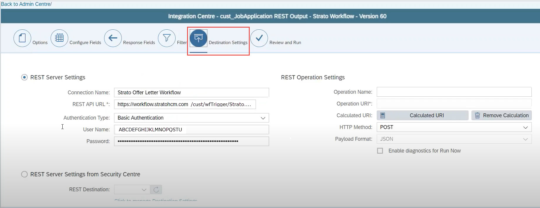 - After setting up your requirements, then for triggering the Strato Workflow, set-up the Destination Settings with the following REST OPERATION SETTINGS: