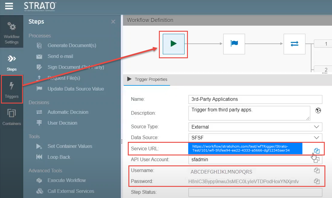- Password (the Password is captured/provided within the Trigger step in the Strato Workflow as shown in the screen highlighted below.)