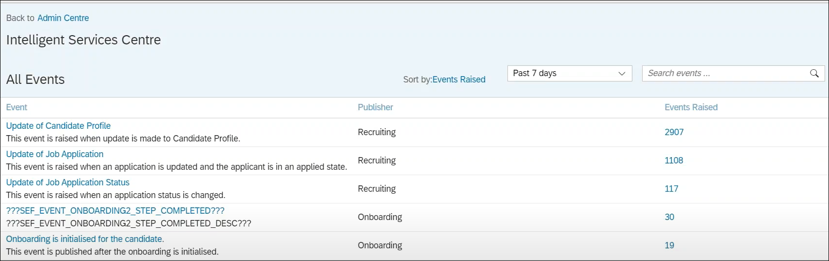 - In SuccessFactors, go to Admin Centre > Intelligent Services. This lists all the events that take place in a process in SFSF. (examples are events in a Recruitment Process)