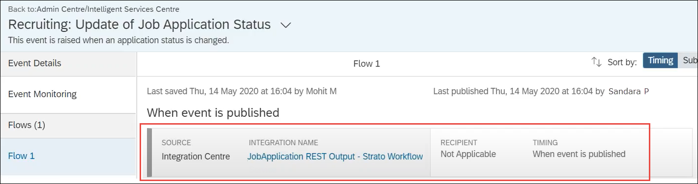 - Click on the specific event to be configured (For example, the workflow and the integration object that was set previously is specific to the Update of Job Application Status event)